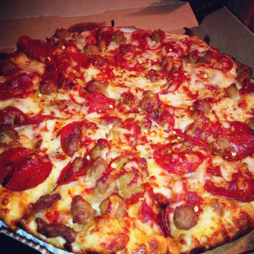 Loads of pepperoni, ham, Italian sausage, beef, fresh onions, fresh green peppers, fresh mushrooms and black olives topped with extra cheese made with 100% real mozzarella.