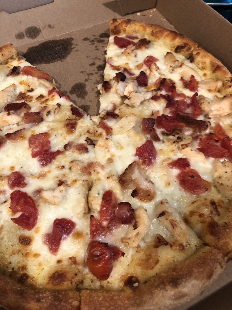 Grilled chicken breast, garlic parmesan white sauce, smoked bacon, tomatoes, cheeses made with 100% real mozzarella and provolone on a cheesy provolone crust.